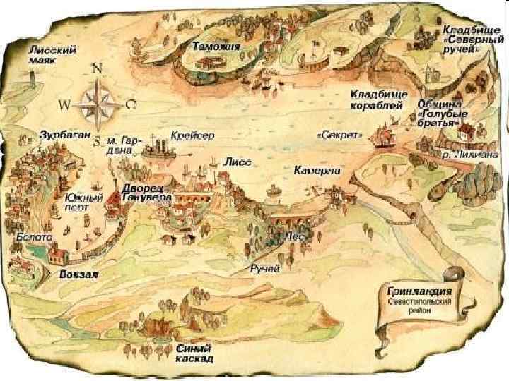 Севастополь - Зурбаган • Лисс — город людей работящих, город простолюдинов, контрабандистов и моряков. По сути, это рабочий район города — Корабельная. В повести «Алые паруса» автор называет героиню Ассоль Корабельская. Каперна — поселок, где родилась Ассоль — это, конечно же, Макаровка. Там был хутор и на нем поселение военных. В повести Ассоль идет из Каперны в Лисс. По мнению В. Адеева, скорее всего, ее путь проходил через Ушакову балку, потому что там есть ручей. Именно там в действительности в начале прошлого века дети пускали кораблики. Кстати, А. Грин очень хорошо знал эту местность, поскольку проводил агитацию среди военных именно в Ушаковой балке.