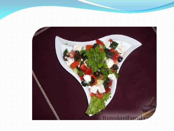 Рецепт греческого салата. Ингредиенты Листья салата Помидор – 3 -4 шт Свежий огурец – 2 -3 шт Болгарский перец красный – 1 / 2 шт Болгарский перец желтый – 1/ 2 шт Соль – по вкусу Красная луковица – 1 небольшая головка Сок половинки лимона Сыр фета – 300 г Маслины без косточек – 3 / 4 банки Зелень – петрушка, укроп Оливковое масло