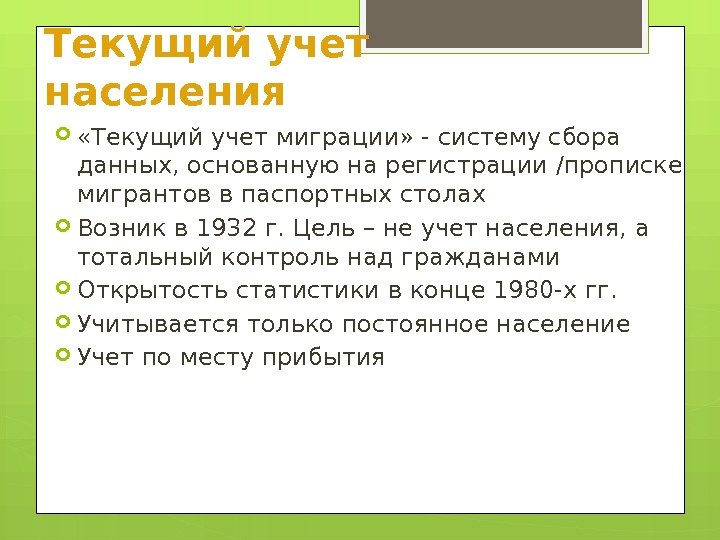 Текущий учет населения «Текущий учет миграции» — систему сбора данных, основанную на регистрации /прописке мигрантов в паспортных столах Возник в 1932 г. Цель – не учет населения, а тотальный контроль над гражданами Открытость статистики в конце 1980 -х гг. Учитывается только постоянное население Учет по месту прибытия