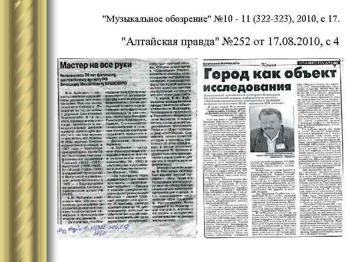 "Музыкальное обозрение" № 10 - 11 (322 -323), 2010, с 17. "Алтайская правда" № 252 от 17. 08. 2010, с 4