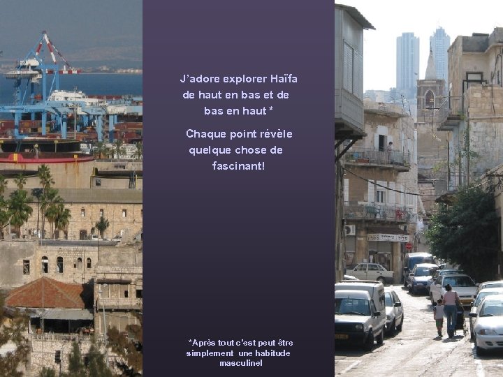 Dans les villes cotières d’Israël, quand vous déplacez le long de la côte vous avancez vers le Nord ou vers le Sud. Lorsque vous conduisez du Carmel vers la plage, vous tournez en fait de 135 degrés. Des coquins, le mont Carmel et la baie de Haïfa. Ajoutez les quartiers résidentiels sur les hauteurs, les "wadis" qui dissèquent la ville, les méandres des rues, et vous obtiendrez une cité qui est tout sauf « tout droit, devant » !