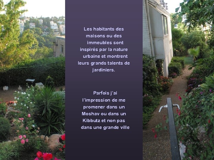 Les habitants des maisons ou des immeubles sont inspirés par la nature urbaine et montrent leurs grands talents de jardiniers. Parfois j’ai l’impression de me promener dans un Moshav ou dans un Kibbutz et non pas dans une grande ville