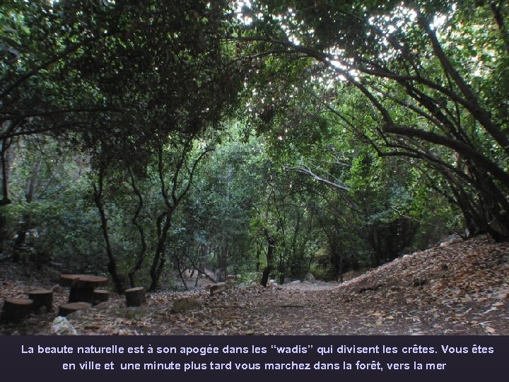 La beaute naturelle est à son apogée dans les “wadis” qui divisent les crêtes. Vous êtes en ville et une minute plus tard vous marchez dans la forêt, vers la mer