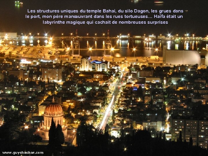 Les structures uniques du temple Bahai, du silo Dagon, les grues dans le port, mon pére manœuvrant dans les rues tortueuses… Haïfa était un labyrinthe magique qui cachait de nombreuses surprises