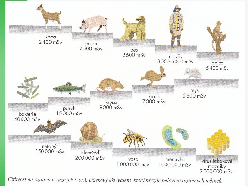 Dávky ozáření a limity: přírodní radiační pozadí občana ČR 2, 5 až 3 m. Sv/rok přírodní radiační pozadí občana Kerali v Indii 17 m. Sv/rok přírodní radiační pozadí občana Guapari v Brazílii 175 m. Sv/rok přírodní radiační pozadí občana Ramsaru v Iránu 400 m. Sv/rok RTG střev 4 m. Sv RTG žaludku 2, 4 m. Sv RTG kyčlí 1, 7 m. Sv limit pro pracovníka se zářením 50 m. Sv/rok 100 m. Sv/5 let pracovník JE Dukovany 0, 4 m. Sv/rok obyvatelstvo v okolí JE Dukovany obdrží 0, 005 m. Sv/rok 3 lety letadlem Praha – USA 0, 38 m. Sv/rok Průměrná efektivní dávka obyvatelstvu ČR v r. 1986 0, 26 m. Sv http: //danyk. wz. cz/ion. html