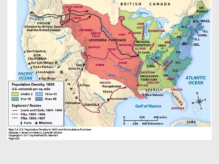 II. The Westward Movement and the Jeffersonian Revolution (cont) D. Jefferson and the West-favored expansion-made it easier and cheaper for families to buy land 1. The Louisiana Purchase- Napoleon was fighting in Haiti and Europe TJ made offer to buy New Orleans but was sold the entire Louisiana territory for 3 cents an acre doubled the size of the UScausing TJ to go against “strict interpretation of the Constitution 2. Secessionist Schemes—Aaron Burr tried to instigate secession twice-foiled by Hamilton-Burr killed Hamilton in a duel-relate to Federalist #10 3. Lewis and Clark Meet the Mandan and Sioux