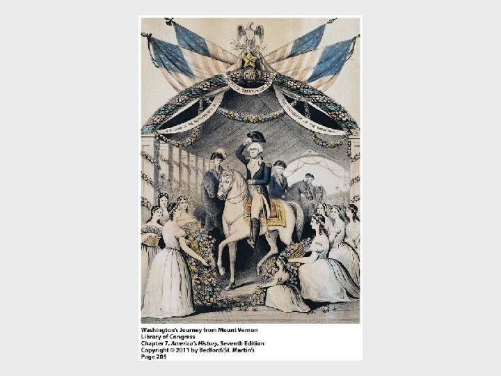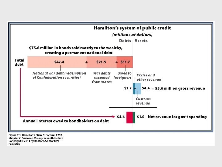I. The Political Crisis of the 1790 s A. B. The Federalists Implement the Constitution p 204 1. Devising the New Government- George Washington elected unanimously by the Electoral College-President had sole authority to remove advisors-set a precedent for future presidents to select their own cabinet 2. The Bill of Rights- set a proper balance between state and national government-safeguarded personal freedoms and legal rights but did not guarantee voting rights Hamilton’s Financial Program p 204 1. Public Credit: Redemption and Assumption 206 - to establish good credit and get the rich invested in the financial success of America 2. Creating a National Bank-to create a uniform currency-make business loans-opposed by TJ as unconstitutional 3. Raising Revenue through Tariffs-revenue not protective-excise tax on whiskey to pay interest on debt