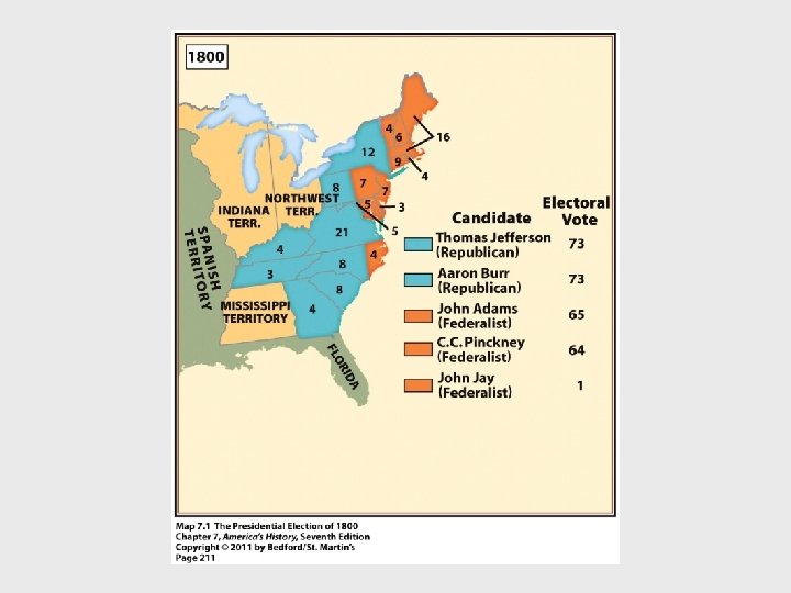 I. The Political Crisis of the 1790 s F. Constitutional Crisis and the “Revolution of 1800” Adams Coercive Acts- The Alien and Sedition Acts suppressed free speech and arrested critics Kentucky and Virginia Resolutions –first time in history states attempted to nullify a federal lawalso first “states rights” argument 1. The Election of 1800 - aka The Revolution of 1800 Adams vs Jefferson first mud slinging campaign House chose Jefferson over Burr due in part to Hamilton support of TJ-his political opponent bloodless transfer of power rare for the times