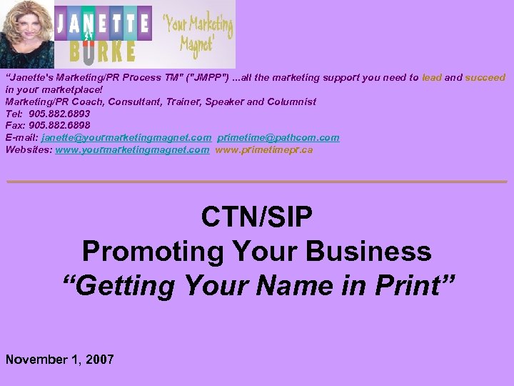 “Janette's Marketing/PR Process TM" ("JMPP"). . . all the marketing support you need to lead and succeed in your marketplace! Marketing/PR Coach, Consultant, Trainer, Speaker and Columnist Tel: 905. 882. 6893 Fax: 905. 882. 6898 E-mail: janette@yourmarketingmagnet. com primetime@pathcom. com Websites: www. yourmarketingmagnet. com www. primetimepr. ca ___________________________________ ’ CTN/SIP Promoting Your Business “Getting Your Name in Print” November 1, 2007