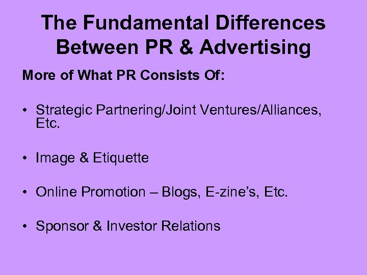 The Fundamental Differences Between PR & Advertising More of What PR Consists Of: • Strategic Partnering/Joint Ventures/Alliances, Etc. • Image & Etiquette • Online Promotion – Blogs, E-zine’s, Etc. • Sponsor & Investor Relations