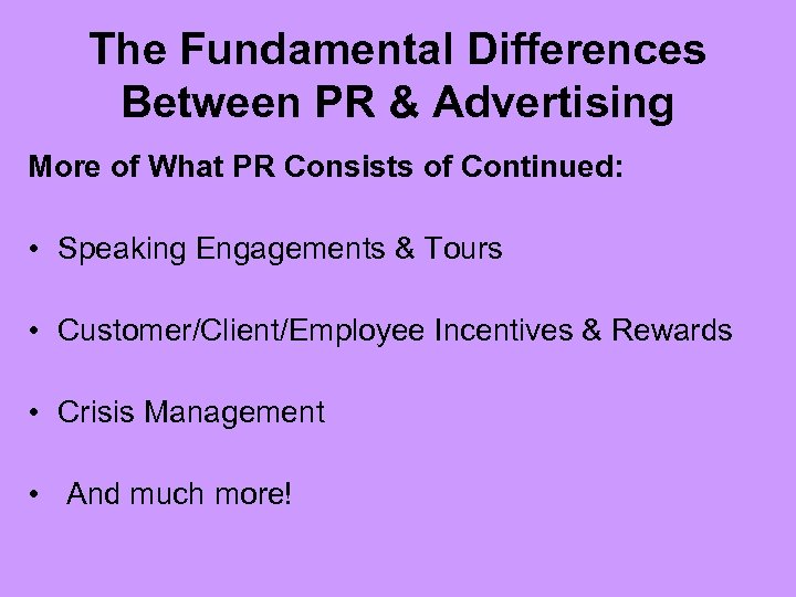 The Fundamental Differences Between PR & Advertising More of What PR Consists of Continued: • Speaking Engagements & Tours • Customer/Client/Employee Incentives & Rewards • Crisis Management • And much more!