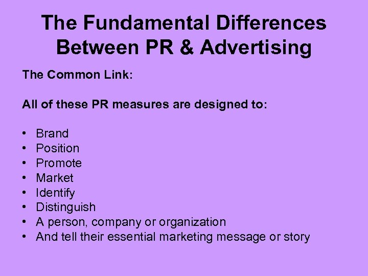 The Fundamental Differences Between PR & Advertising The Common Link: All of these PR measures are designed to: • • Brand Position Promote Market Identify Distinguish A person, company or organization And tell their essential marketing message or story