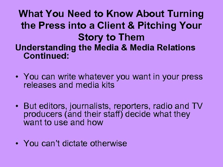 What You Need to Know About Turning the Press into a Client & Pitching Your Story to Them Understanding the Media & Media Relations Continued: • You can write whatever you want in your press releases and media kits • But editors, journalists, reporters, radio and TV producers (and their staff) decide what they want to use and how • You can’t dictate otherwise