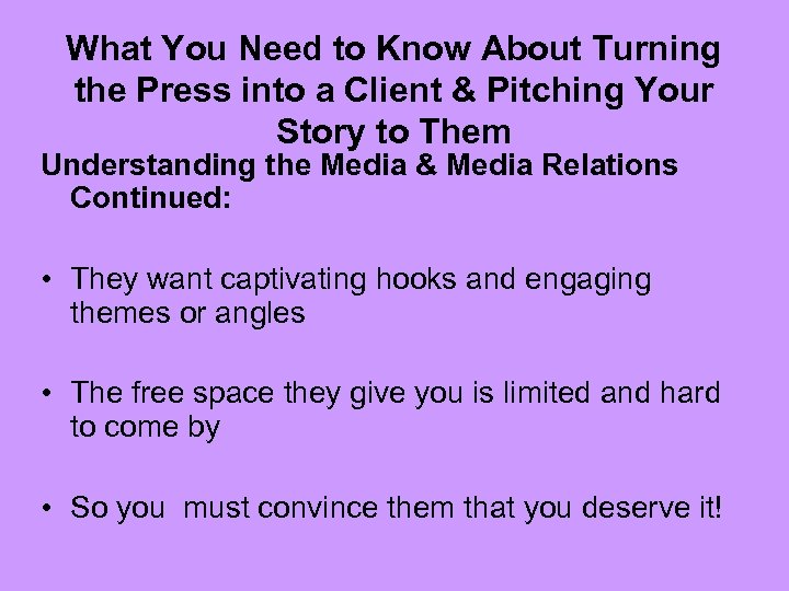 What You Need to Know About Turning the Press into a Client & Pitching Your Story to Them Understanding the Media & Media Relations Continued: • They want captivating hooks and engaging themes or angles • The free space they give you is limited and hard to come by • So you must convince them that you deserve it!