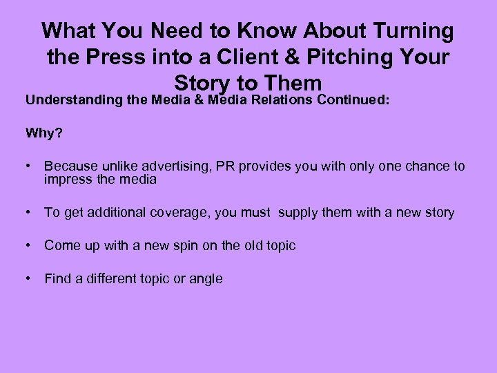 What You Need to Know About Turning the Press into a Client & Pitching Your Story to Them Understanding the Media & Media Relations Continued: Why? • Because unlike advertising, PR provides you with only one chance to impress the media • To get additional coverage, you must supply them with a new story • Come up with a new spin on the old topic • Find a different topic or angle