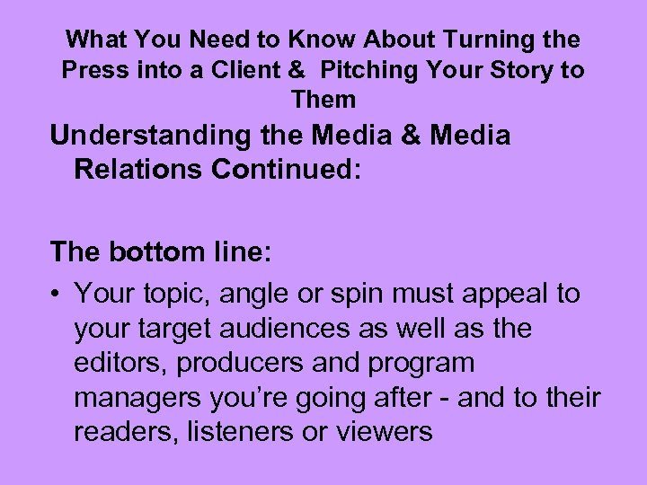 What You Need to Know About Turning the Press into a Client & Pitching Your Story to Them Understanding the Media & Media Relations Continued: The bottom line: • Your topic, angle or spin must appeal to your target audiences as well as the editors, producers and program managers you’re going after - and to their readers, listeners or viewers