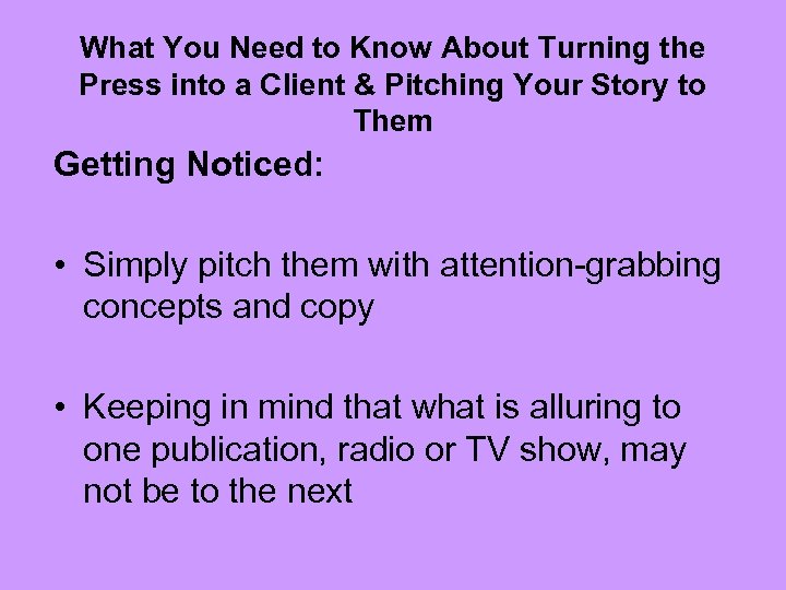What You Need to Know About Turning the Press into a Client & Pitching Your Story to Them Getting Noticed: • Simply pitch them with attention-grabbing concepts and copy • Keeping in mind that what is alluring to one publication, radio or TV show, may not be to the next