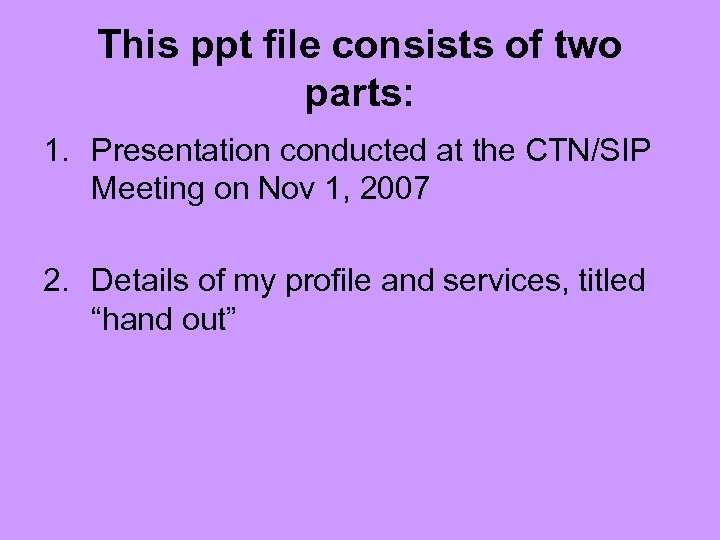This ppt file consists of two parts: 1. Presentation conducted at the CTN/SIP Meeting on Nov 1, 2007 2. Details of my profile and services, titled “hand out”