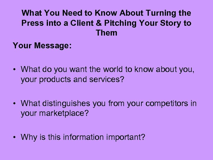 What You Need to Know About Turning the Press into a Client & Pitching Your Story to Them Your Message: • What do you want the world to know about you, your products and services? • What distinguishes you from your competitors in your marketplace? • Why is this information important?