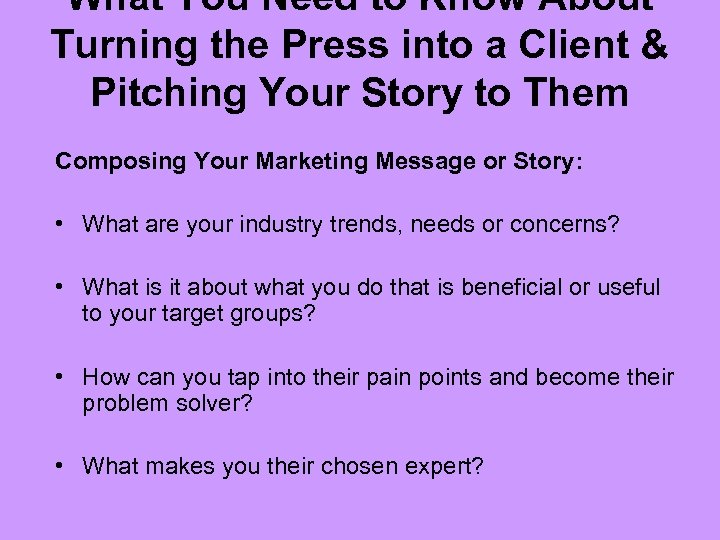 What You Need to Know About Turning the Press into a Client & Pitching Your Story to Them Composing Your Marketing Message or Story: • What are your industry trends, needs or concerns? • What is it about what you do that is beneficial or useful to your target groups? • How can you tap into their pain points and become their problem solver? • What makes you their chosen expert?