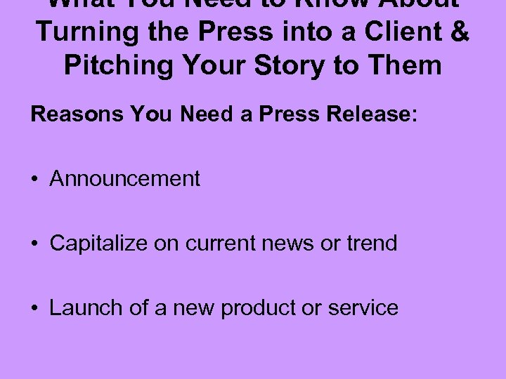 What You Need to Know About Turning the Press into a Client & Pitching Your Story to Them Reasons You Need a Press Release: • Announcement • Capitalize on current news or trend • Launch of a new product or service