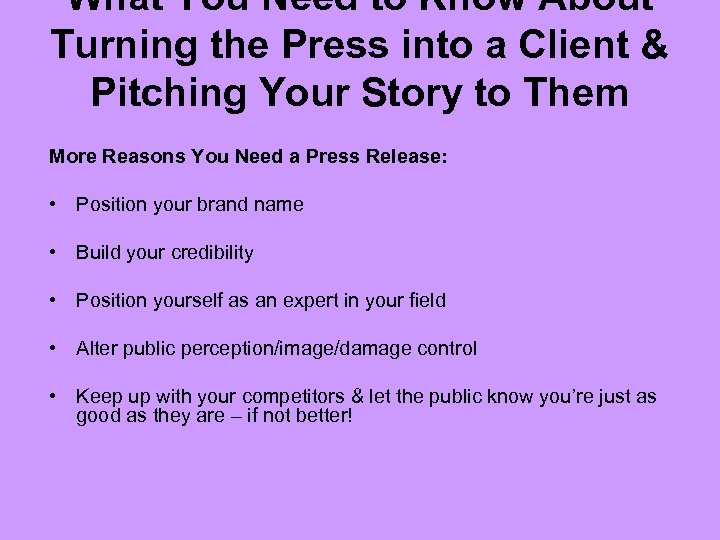 What You Need to Know About Turning the Press into a Client & Pitching Your Story to Them More Reasons You Need a Press Release: • Position your brand name • Build your credibility • Position yourself as an expert in your field • Alter public perception/image/damage control • Keep up with your competitors & let the public know you’re just as good as they are – if not better!