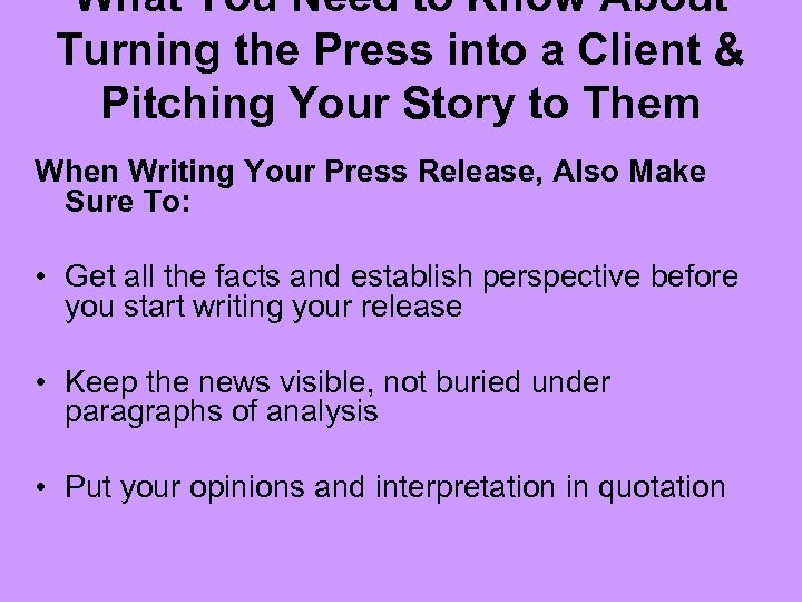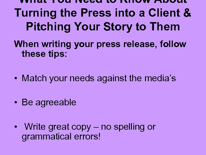 What You Need to Know About Turning the Press into a Client & Pitching Your Story to Them When writing your press release, follow these tips: • Match your needs against the media’s • Be agreeable • Write great copy – no spelling or grammatical errors!