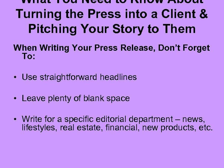 What You Need to Know About Turning the Press into a Client & Pitching Your Story to Them When Writing Your Press Release, Don’t Forget To: • Use straightforward headlines • Leave plenty of blank space • Write for a specific editorial department – news, lifestyles, real estate, financial, new products, etc.