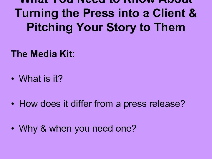 What You Need to Know About Turning the Press into a Client & Pitching Your Story to Them The Media Kit: • What is it? • How does it differ from a press release? • Why & when you need one?