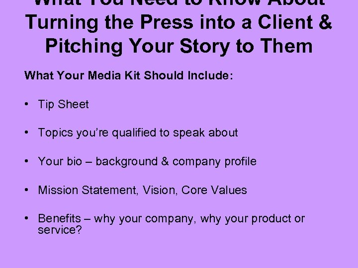 What You Need to Know About Turning the Press into a Client & Pitching Your Story to Them What Your Media Kit Should Include: • Tip Sheet • Topics you’re qualified to speak about • Your bio – background & company profile • Mission Statement, Vision, Core Values • Benefits – why your company, why your product or service?