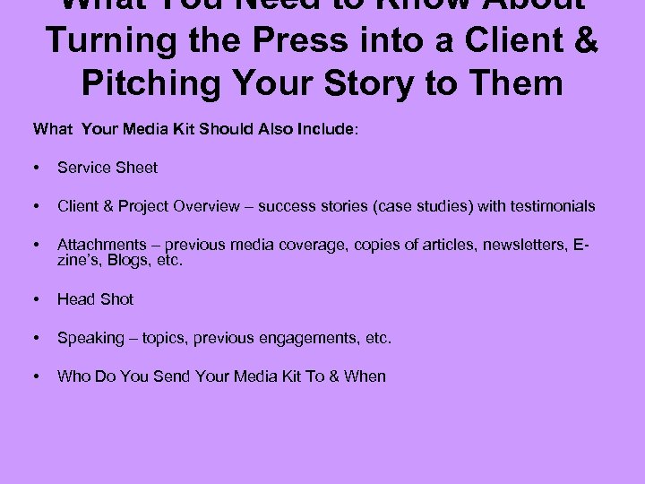 What You Need to Know About Turning the Press into a Client & Pitching Your Story to Them What Your Media Kit Should Also Include: • Service Sheet • Client & Project Overview – success stories (case studies) with testimonials • Attachments – previous media coverage, copies of articles, newsletters, Ezine’s, Blogs, etc. • Head Shot • Speaking – topics, previous engagements, etc. • Who Do You Send Your Media Kit To & When