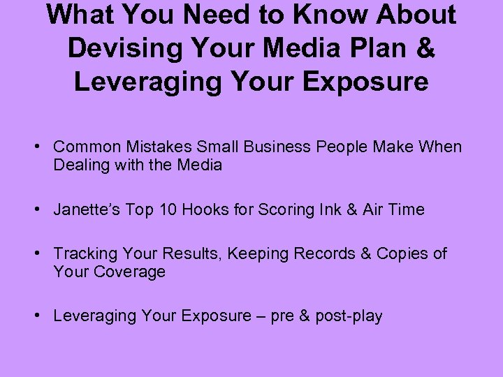 What You Need to Know About Devising Your Media Plan & Leveraging Your Exposure • Common Mistakes Small Business People Make When Dealing with the Media • Janette’s Top 10 Hooks for Scoring Ink & Air Time • Tracking Your Results, Keeping Records & Copies of Your Coverage • Leveraging Your Exposure – pre & post-play