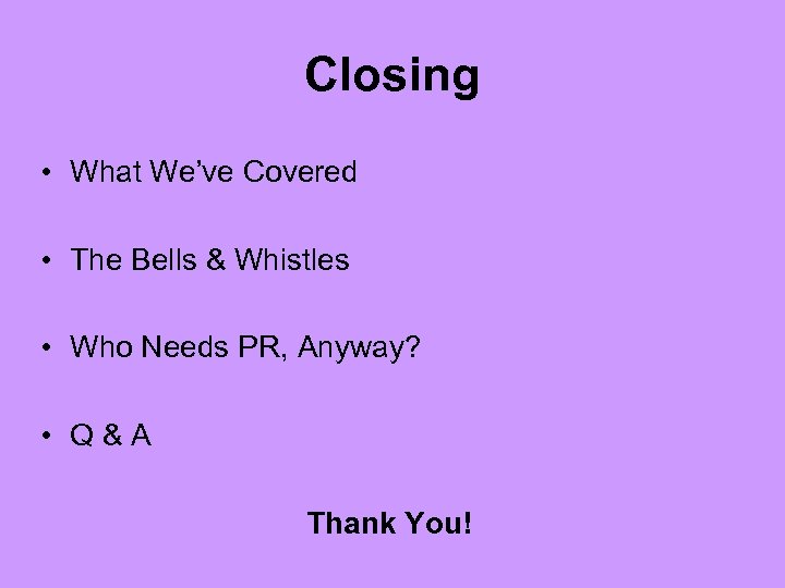 Closing • What We’ve Covered • The Bells & Whistles • Who Needs PR, Anyway? • Q&A Thank You!