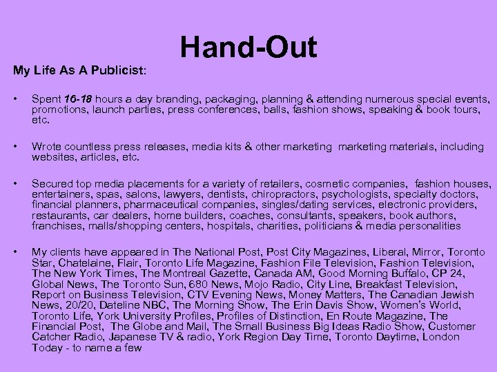 My Life As A Publicist: Hand-Out • Spent 16 -18 hours a day branding, packaging, planning & attending numerous special events, promotions, launch parties, press conferences, balls, fashion shows, speaking & book tours, etc. • Wrote countless press releases, media kits & other marketing materials, including websites, articles, etc. • Secured top media placements for a variety of retailers, cosmetic companies, fashion houses, entertainers, spas, salons, lawyers, dentists, chiropractors, psychologists, specialty doctors, financial planners, pharmaceutical companies, singles/dating services, electronic providers, restaurants, car dealers, home builders, coaches, consultants, speakers, book authors, franchises, malls/shopping centers, hospitals, charities, politicians & media personalities • My clients have appeared in The National Post, Post City Magazines, Liberal, Mirror, Toronto Star, Chatelaine, Flair, Toronto Life Magazine, Fashion File Television, Fashion Television, The New York Times, The Montreal Gazette, Canada AM, Good Morning Buffalo, CP 24, Global News, The Toronto Sun, 680 News, Mojo Radio, City Line, Breakfast Television, Report on Business Television, CTV Evening News, Money Matters, The Canadian Jewish News, 20/20, Dateline NBC, The Morning Show, The Erin Davis Show, Women’s World, Toronto Life, York University Profiles, Profiles of Distinction, En Route Magazine, The Financial Post, The Globe and Mail, The Small Business Big Ideas Radio Show, Customer Catcher Radio, Japanese TV & radio, York Region Day Time, Toronto Daytime, London Today - to name a few