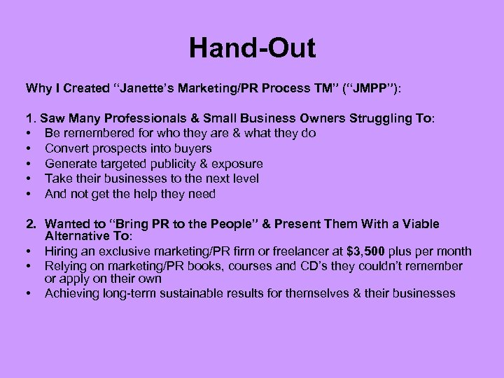 Hand-Out Why I Created “Janette’s Marketing/PR Process TM” (“JMPP”): 1. Saw Many Professionals & Small Business Owners Struggling To: • Be remembered for who they are & what they do • Convert prospects into buyers • Generate targeted publicity & exposure • Take their businesses to the next level • And not get the help they need 2. Wanted to “Bring PR to the People” & Present Them With a Viable Alternative To: • Hiring an exclusive marketing/PR firm or freelancer at $3, 500 plus per month • Relying on marketing/PR books, courses and CD’s they couldn’t remember or apply on their own • Achieving long-term sustainable results for themselves & their businesses