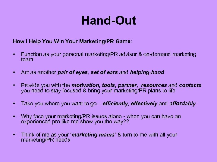 Hand-Out How I Help You Win Your Marketing/PR Game: • Function as your personal marketing/PR advisor & on-demand marketing team • Act as another pair of eyes, set of ears and helping-hand • Provide you with the motivation, tools, partner, resources and contacts you need to stay focused & bring your marketing/PR plans to life • Take you where you want to go – efficiently, effectively and affordably • Why face your marketing/PR issues alone - when you can have an experienced pro like me show you the way? ? • Think of me as your ‘marketing mama’ & turn to me with all your marketing/PR needs