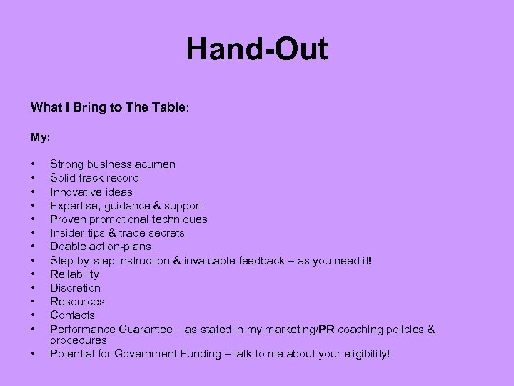 Hand-Out What I Bring to The Table: My: • • • • Strong business acumen Solid track record Innovative ideas Expertise, guidance & support Proven promotional techniques Insider tips & trade secrets Doable action-plans Step-by-step instruction & invaluable feedback – as you need it! Reliability Discretion Resources Contacts Performance Guarantee – as stated in my marketing/PR coaching policies & procedures Potential for Government Funding – talk to me about your eligibility!