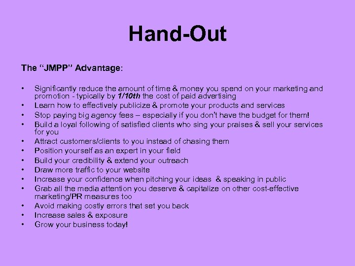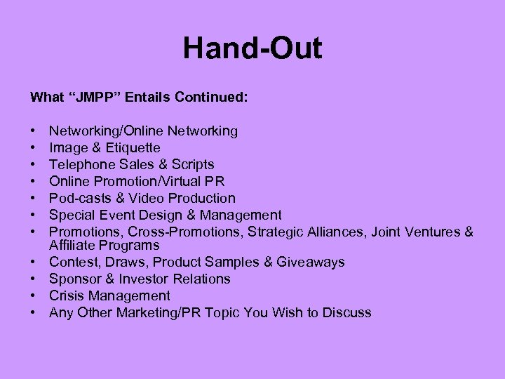 Hand-Out What “JMPP” Entails Continued: • • • Networking/Online Networking Image & Etiquette Telephone Sales & Scripts Online Promotion/Virtual PR Pod-casts & Video Production Special Event Design & Management Promotions, Cross-Promotions, Strategic Alliances, Joint Ventures & Affiliate Programs Contest, Draws, Product Samples & Giveaways Sponsor & Investor Relations Crisis Management Any Other Marketing/PR Topic You Wish to Discuss