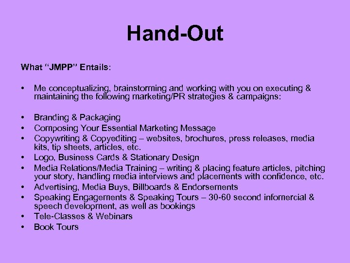 Hand-Out What “JMPP” Entails: • Me conceptualizing, brainstorming and working with you on executing & maintaining the following marketing/PR strategies & campaigns: • • • Branding & Packaging Composing Your Essential Marketing Message Copywriting & Copyediting – websites, brochures, press releases, media kits, tip sheets, articles, etc. Logo, Business Cards & Stationary Design Media Relations/Media Training – writing & placing feature articles, pitching your story, handling media interviews and placements with confidence, etc. Advertising, Media Buys, Billboards & Endorsements Speaking Engagements & Speaking Tours – 30 -60 second infomercial & speech development, as well as bookings Tele-Classes & Webinars Book Tours • • •