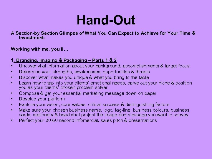 Hand-Out A Section-by Section Glimpse of What You Can Expect to Achieve for Your Time & Investment: Working with me, you’ll… 1. Branding, Imaging & Packaging – Parts 1 & 2 • Uncover vital information about your background, accomplishments & target focus • Determine your strengths, weaknesses, opportunities & threats • Discover what makes you unique & what you bring to the table • Learn how to tap into your clients’ emotional needs, carve out your niche & position you as your clients’ chosen problem solver • Compose & get your essential marketing message down on paper • Develop your platform • Explore your vision, core values, critical success & distinguishing factors • Make sure your chosen business name, logo, tag-line, business colours, business cards, stationary & head shot project the image and message you want to convey • Perfect your 30 -60 second infomercial, sales pitch & presentations