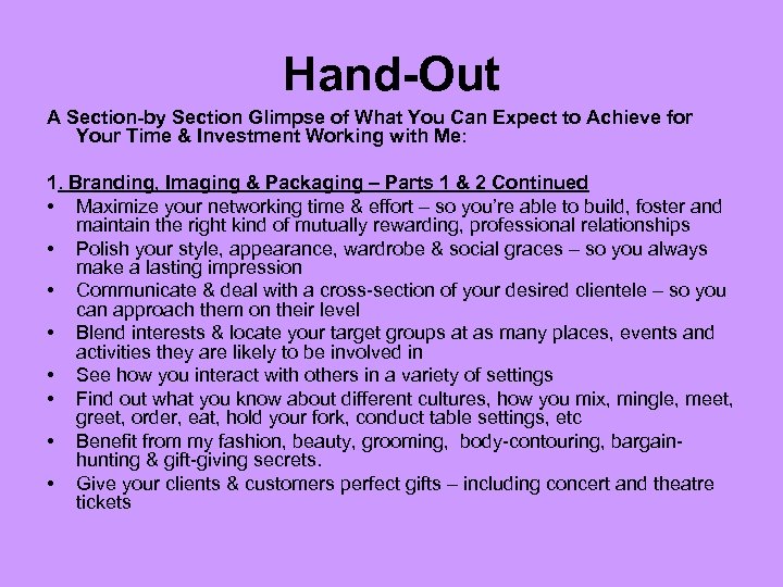 Hand-Out A Section-by Section Glimpse of What You Can Expect to Achieve for Your Time & Investment Working with Me: 1. Branding, Imaging & Packaging – Parts 1 & 2 Continued • Maximize your networking time & effort – so you’re able to build, foster and maintain the right kind of mutually rewarding, professional relationships • Polish your style, appearance, wardrobe & social graces – so you always make a lasting impression • Communicate & deal with a cross-section of your desired clientele – so you can approach them on their level • Blend interests & locate your target groups at as many places, events and activities they are likely to be involved in • See how you interact with others in a variety of settings • Find out what you know about different cultures, how you mix, mingle, meet, greet, order, eat, hold your fork, conduct table settings, etc • Benefit from my fashion, beauty, grooming, body-contouring, bargainhunting & gift-giving secrets. • Give your clients & customers perfect gifts – including concert and theatre tickets