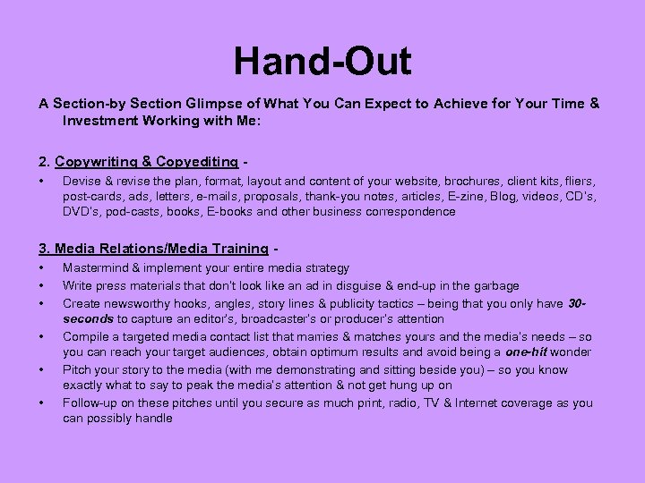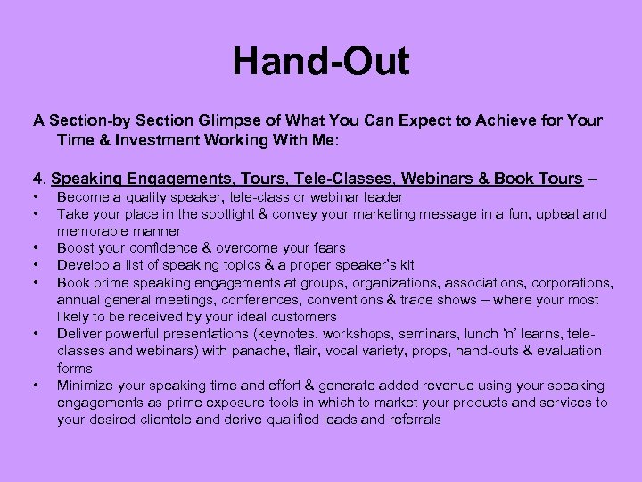 Hand-Out A Section-by Section Glimpse of What You Can Expect to Achieve for Your Time & Investment Working With Me: 4. Speaking Engagements, Tours, Tele-Classes, Webinars & Book Tours – • • Become a quality speaker, tele-class or webinar leader Take your place in the spotlight & convey your marketing message in a fun, upbeat and memorable manner Boost your confidence & overcome your fears Develop a list of speaking topics & a proper speaker’s kit Book prime speaking engagements at groups, organizations, associations, corporations, annual general meetings, conferences, conventions & trade shows – where your most likely to be received by your ideal customers Deliver powerful presentations (keynotes, workshops, seminars, lunch ‘n’ learns, teleclasses and webinars) with panache, flair, vocal variety, props, hand-outs & evaluation forms Minimize your speaking time and effort & generate added revenue using your speaking engagements as prime exposure tools in which to market your products and services to your desired clientele and derive qualified leads and referrals