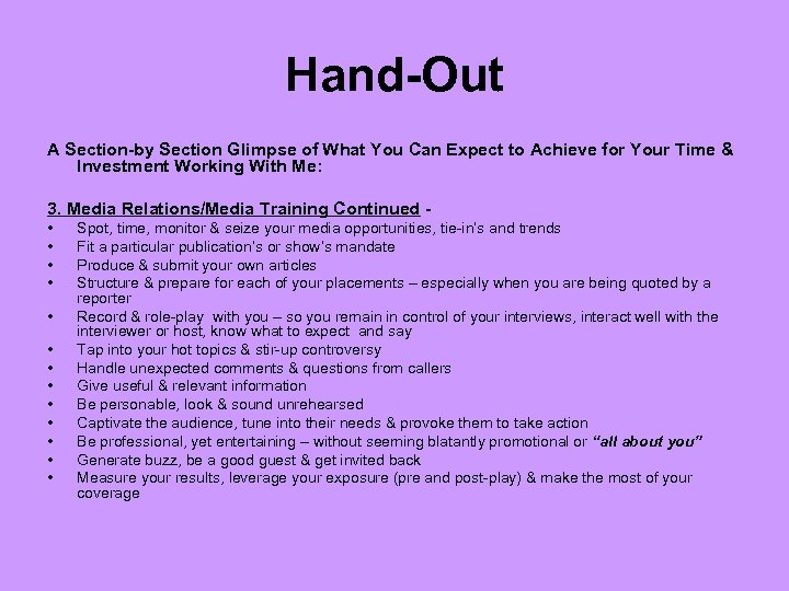 Hand-Out A Section-by Section Glimpse of What You Can Expect to Achieve for Your Time & Investment Working With Me: 3. Media Relations/Media Training Continued • • • • Spot, time, monitor & seize your media opportunities, tie-in’s and trends Fit a particular publication’s or show’s mandate Produce & submit your own articles Structure & prepare for each of your placements – especially when you are being quoted by a reporter Record & role-play with you – so you remain in control of your interviews, interact well with the interviewer or host, know what to expect and say Tap into your hot topics & stir-up controversy Handle unexpected comments & questions from callers Give useful & relevant information Be personable, look & sound unrehearsed Captivate the audience, tune into their needs & provoke them to take action Be professional, yet entertaining – without seeming blatantly promotional or “all about you” Generate buzz, be a good guest & get invited back Measure your results, leverage your exposure (pre and post-play) & make the most of your coverage