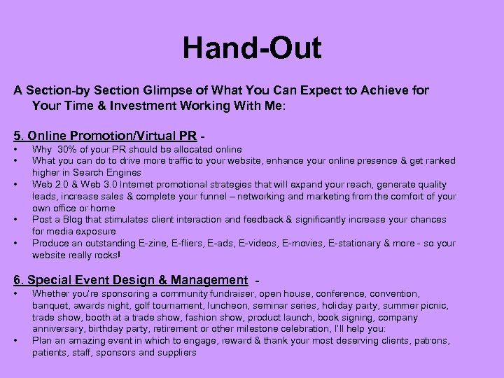 Hand-Out A Section-by Section Glimpse of What You Can Expect to Achieve for Your Time & Investment Working With Me: 5. Online Promotion/Virtual PR • • • Why 30% of your PR should be allocated online What you can do to drive more traffic to your website, enhance your online presence & get ranked higher in Search Engines Web 2. 0 & Web 3. 0 Internet promotional strategies that will expand your reach, generate quality leads, increase sales & complete your funnel – networking and marketing from the comfort of your own office or home Post a Blog that stimulates client interaction and feedback & significantly increase your chances for media exposure Produce an outstanding E-zine, E-fliers, E-ads, E-videos, E-movies, E-stationary & more - so your website really rocks! 6. Special Event Design & Management • • Whether you’re sponsoring a community fundraiser, open house, conference, convention, banquet, awards night, golf tournament, luncheon, seminar series, holiday party, summer picnic, trade show, booth at a trade show, fashion show, product launch, book signing, company anniversary, birthday party, retirement or other milestone celebration, I’ll help you: Plan an amazing event in which to engage, reward & thank your most deserving clients, patrons, patients, staff, sponsors and suppliers