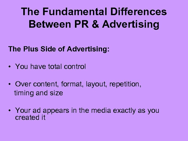 The Fundamental Differences Between PR & Advertising The Plus Side of Advertising: • You have total control • Over content, format, layout, repetition, timing and size • Your ad appears in the media exactly as you created it
