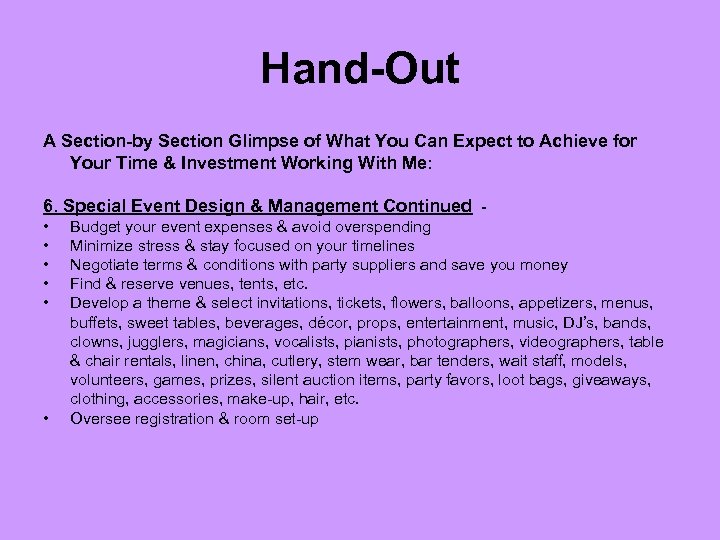 Hand-Out A Section-by Section Glimpse of What You Can Expect to Achieve for Your Time & Investment Working With Me: 6. Special Event Design & Management Continued • • • Adhere to customs, safety codes, legalities, protocols & processions Write, rehearse & deliver speeches Impress the crowd with current dance moves Design fliers, posters, announcements, tickets & signage Publicize & promote your event Increase attendance & stimulate ticket sales by attracting celebrities and Alisters Build goodwill & trust Foster better business relations Relax, mingle & enjoy yourself!