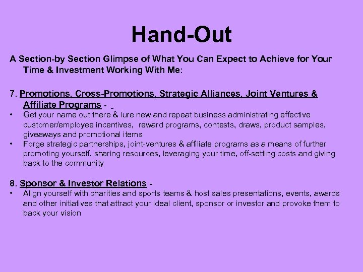 Hand-Out A Section-by Section Glimpse of What You Can Expect to Achieve for Your Time & Investment Working With Me: 7. Promotions, Cross-Promotions, Strategic Alliances, Joint Ventures & Affiliate Programs • • Get your name out there & lure new and repeat business administrating effective customer/employee incentives, reward programs, contests, draws, product samples, giveaways and promotional items Forge strategic partnerships, joint-ventures & affiliate programs as a means of further promoting yourself, sharing resources, leveraging your time, off-setting costs and giving back to the community 8. Sponsor & Investor Relations • Align yourself with charities and sports teams & host sales presentations, events, awards and other initiatives that attract your ideal client, sponsor or investor and provoke them to back your vision