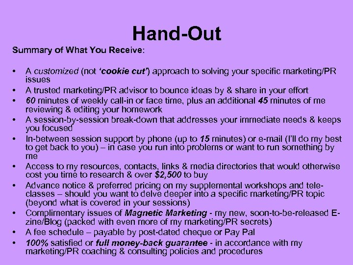 Hand-Out Summary of What You Receive: • • • A customized (not ‘cookie cut’) approach to solving your specific marketing/PR issues A trusted marketing/PR advisor to bounce ideas by & share in your effort 60 minutes of weekly call-in or face time, plus an additional 45 minutes of me reviewing & editing your homework A session-by-session break-down that addresses your immediate needs & keeps you focused In-between session support by phone (up to 15 minutes) or e-mail (I’ll do my best to get back to you) – in case you run into problems or want to run something by me Access to my resources, contacts, links & media directories that would otherwise cost you time to research & over $2, 500 to buy Advance notice & preferred pricing on my supplemental workshops and teleclasses – should you want to delve deeper into a specific marketing/PR topic (beyond what is covered in your sessions) Complimentary issues of Magnetic Marketing - my new, soon-to-be-released Ezine/Blog (packed with even more of my marketing/PR secrets) A fee schedule – payable by post-dated cheque or Pay Pal 100% satisfied or full money-back guarantee - in accordance with my marketing/PR coaching & consulting policies and procedures