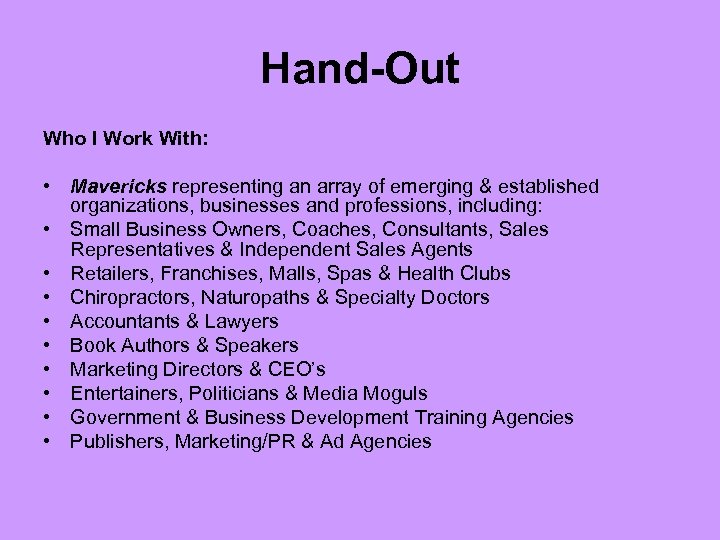 Hand-Out Who I Work With: • Mavericks representing an array of emerging & established organizations, businesses and professions, including: • Small Business Owners, Coaches, Consultants, Sales Representatives & Independent Sales Agents • Retailers, Franchises, Malls, Spas & Health Clubs • Chiropractors, Naturopaths & Specialty Doctors • Accountants & Lawyers • Book Authors & Speakers • Marketing Directors & CEO’s • Entertainers, Politicians & Media Moguls • Government & Business Development Training Agencies • Publishers, Marketing/PR & Ad Agencies