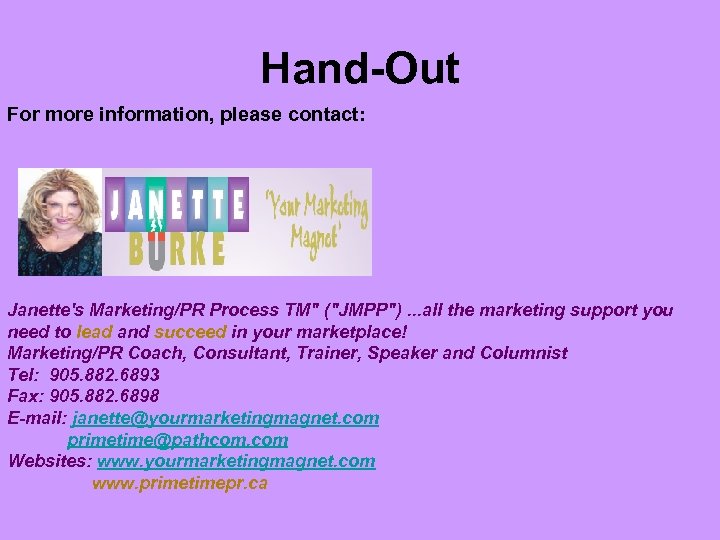 Hand-Out For more information, please contact: Janette's Marketing/PR Process TM" ("JMPP"). . . all the marketing support you need to lead and succeed in your marketplace! Marketing/PR Coach, Consultant, Trainer, Speaker and Columnist Tel: 905. 882. 6893 Fax: 905. 882. 6898 E-mail: janette@yourmarketingmagnet. com primetime@pathcom. com Websites: www. yourmarketingmagnet. com www. primetimepr. ca